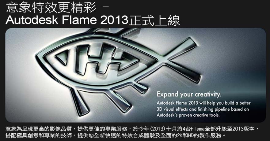 Flame 2012 於9月份正式上線,新版本除了快速的運算模式之外也增加多樣最新的特效功能,包括在真實的3D場景中,提供更多的光源種類及擬真的3D光暈效果,並針對合成方式及效果提供更多更先進的選項。