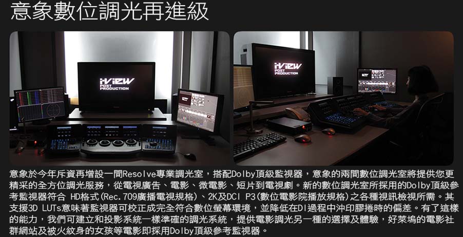 我們採用最高等級的DaVinci Resolve Linux版本搭配4GPU圖形加速卡,搭配好萊塢最信賴的Cine-Tal監視器,不但可以真實的呈現影像,即使複雜的多層調光及power-window也能達到即時調光(Real- time Grading的效能),且運算快速,有別於低階的Mac OS版。新版更加入了noise reducer可過濾傳統影片掃描時所產生的粒子,讓影片更乾淨及清晰。